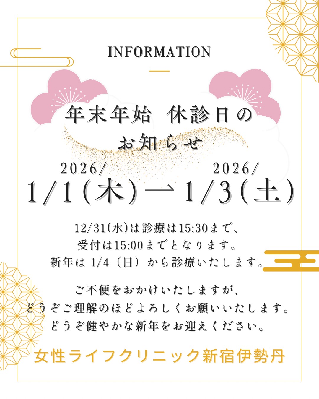 12/31(水)の診療は 15:30(15:00受付)まで