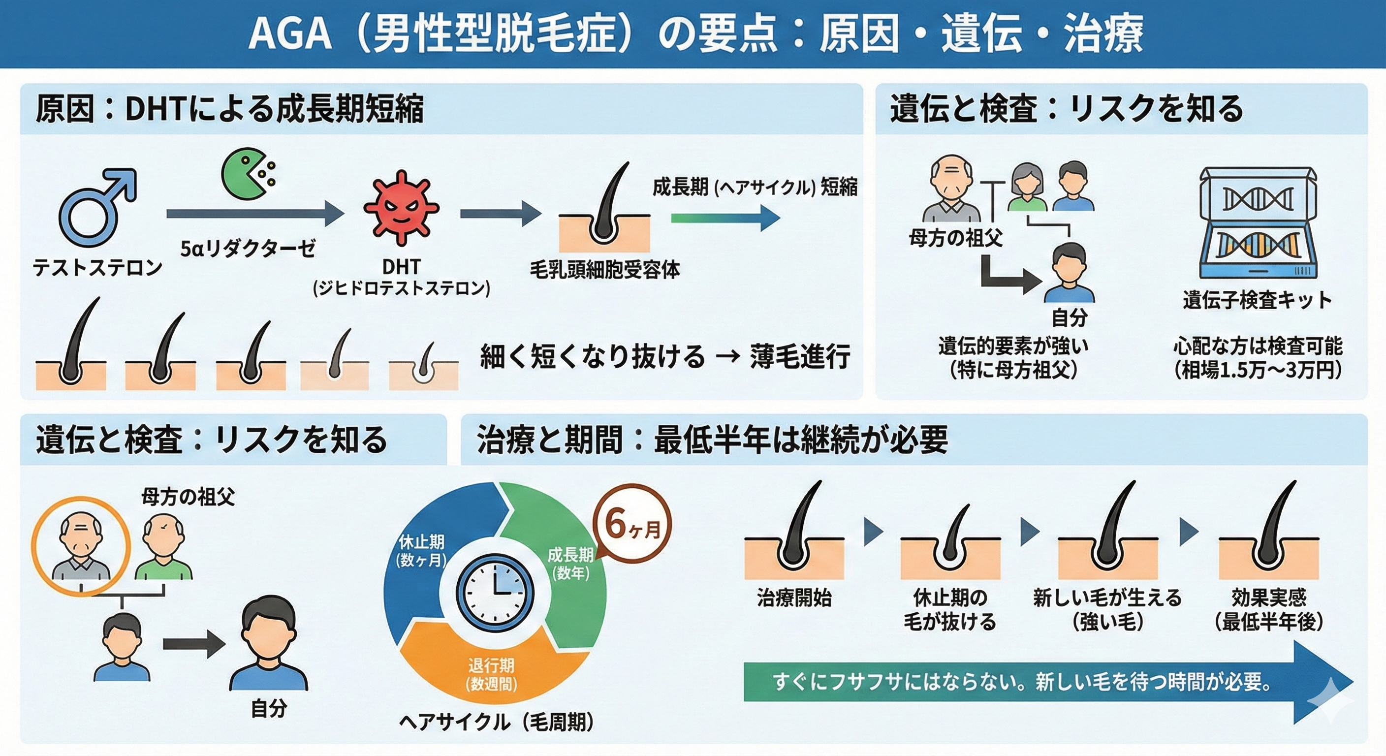 AGAは遺伝的要素が強く、特に母方の祖父の薄毛の影響を強く受けると言われています。自分がAGAになりやすい体質か心配な方は、遺伝子検査キット(相場15,000円〜30,000円)で調べることも可能です。