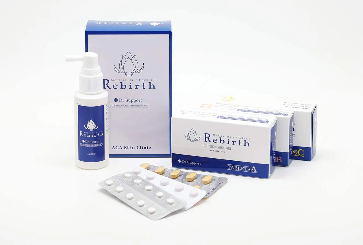 | 内容 | Rebirth タブレットA(ミノキシジル) Rebirth タブレットB(フィナステリド) Rebirth タブレットC(サプリメント) Rebirth リキッド(ミノキシジル外用薬) |