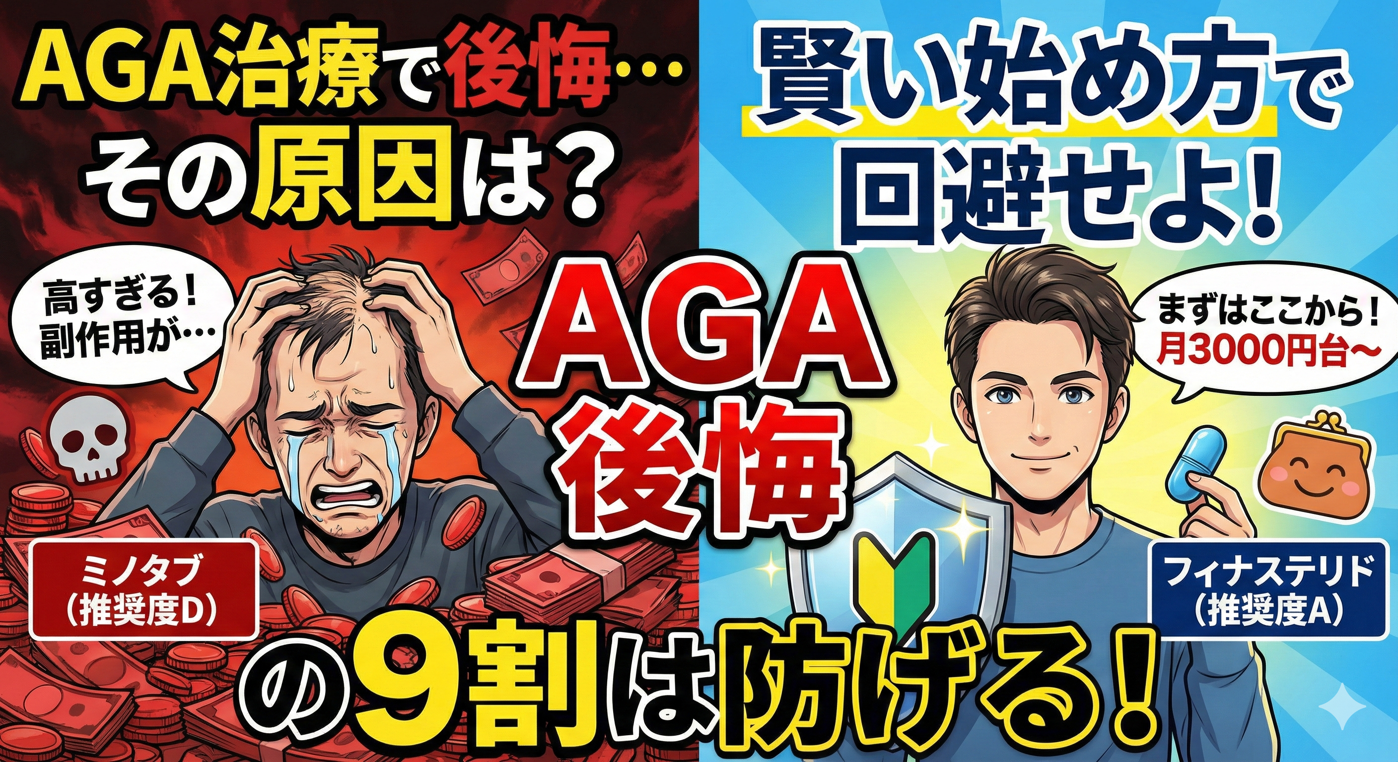 AGA治療の後悔のほとんどは、「いきなり高額でハイリスクなミノタブに手を出す」ことと「治療の経過に関する知識不足」が原因です。