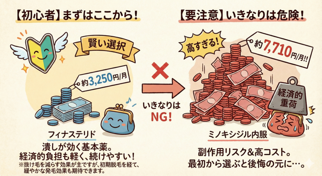 「効果が出るまでの期間」と「初期脱毛」は、どんな薬を選んでも(たとえ推奨度Aのフィナステリドでも)多くの人が通る道です。しかし、ここでも最初に選んだ薬の値段が、精神的な負担を大きく左右します。