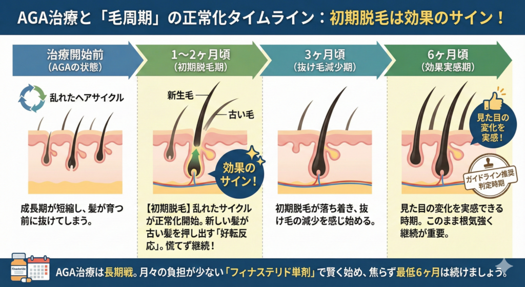 日本皮膚科学会のガイドラインでも、治療効果の判定は通常6ヶ月間の継続後に行うことが推奨されています。多くの場合、3ヶ月ほどで抜け毛の減少を感じ始め、6ヶ月頃から見た目の変化を実感できます。
