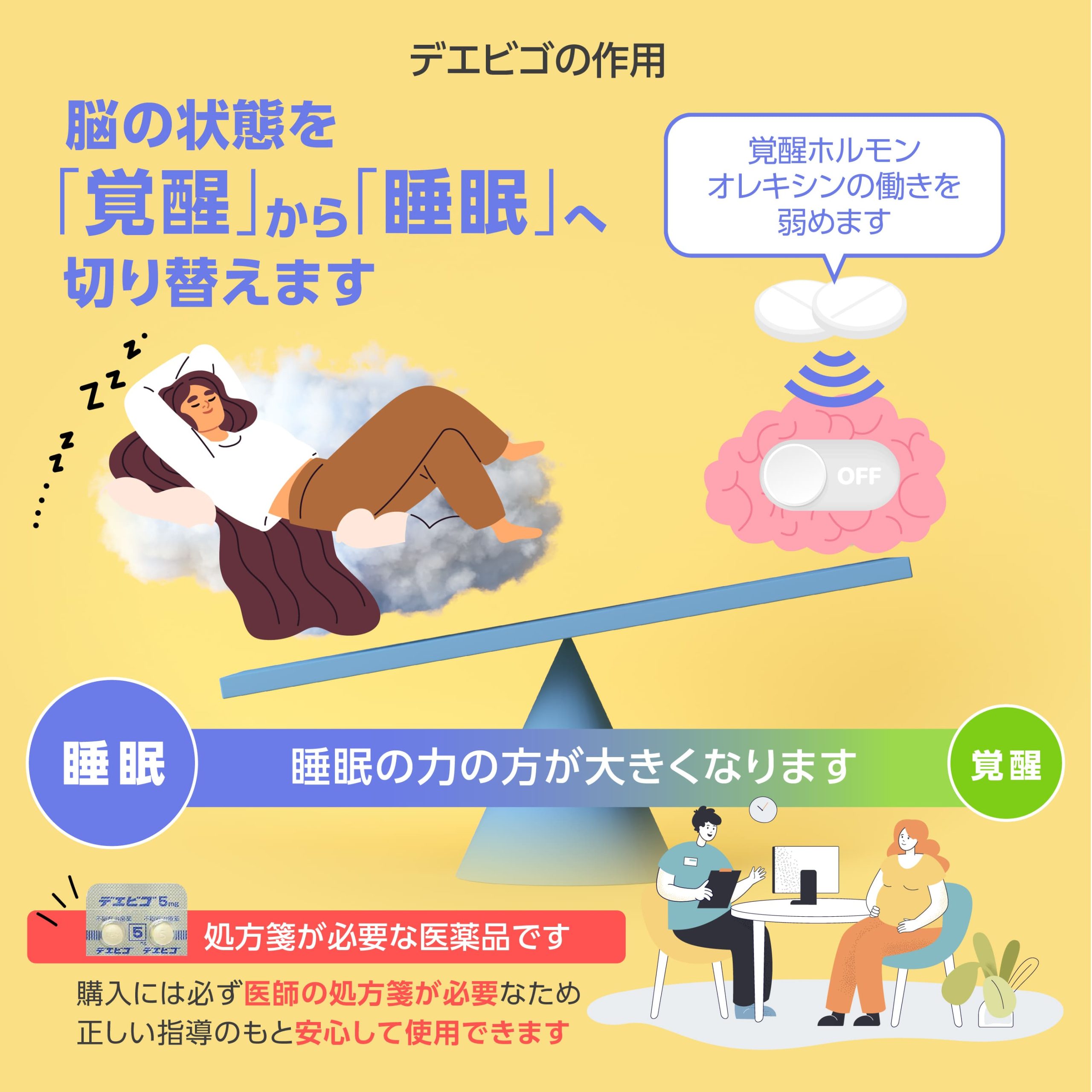 デエビゴ錠は、自然な眠気を促して睡眠時の覚醒を防ぐ睡眠薬です。