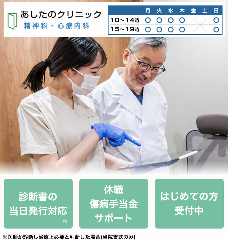 相談の際は、医師による診断のもとで診断書の発行が必要であると判断されたら、即日で診断書を発行してもらえます。