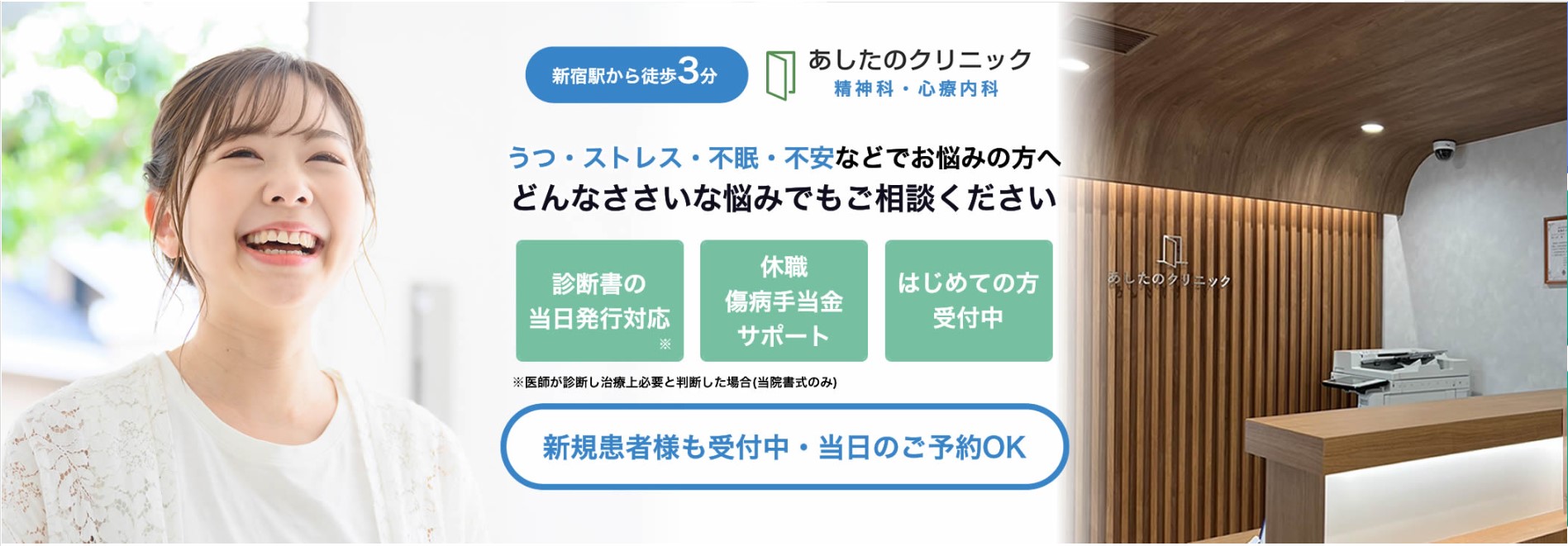 あしたのクリニックは、不眠のほか、ストレスや不安などでも相談できるクリニックです。